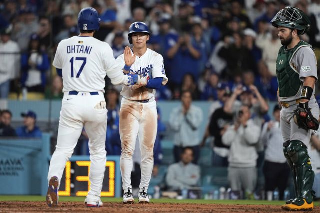 LOS ANGELES, CALIFORNIA - MAY 15: Shohei Ohtani #17 of the Los Angeles Dodgers celebrates his three run home run with Hyeseong Kim #6 in front of Shea Langeliers #23 of the Athletics, to take a 10-2 lead, during the third inning at Dodger Stadium on May 15, 2025 in Los Angeles, California. Ronald Martinez/Getty Images/AFP (Photo by RONALD MARTINEZ / GETTY IMAGES NORTH AMERICA / Getty Images via AFP)/2025-05-16 12:53:41/