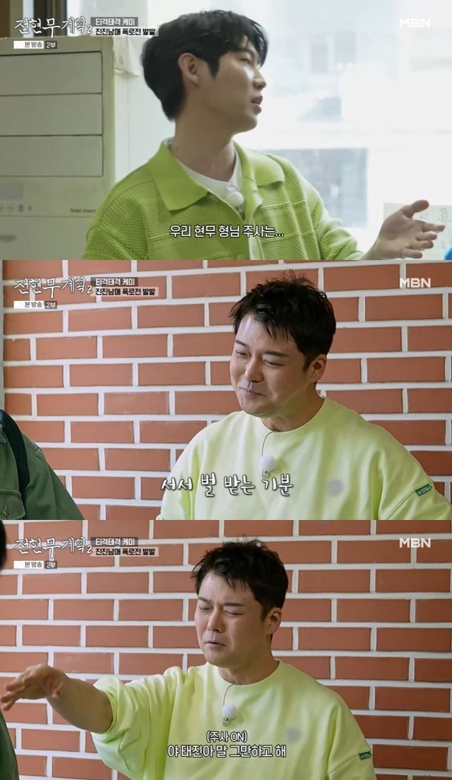 그러자 손태진은 "나의 주사는 말이 많아지고, 우리 전현무 형님의 주사는.."이라고 입을 열었다. 이를 듣던 전현무는 벌을 받는 듯한 표정을 지어 웃음을 자아냈다.