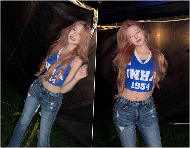 그는 'INHA'라는 문구가 새겨진 의상을 입고 있어 눈길을 끌었다. 특히 상의는 리폼을 통해 크롭톱 스타일로 연출했고, 여기에 데님 팬츠를 매치해 가녀린 허리 라인이 돋보이는 패션을 완성했다. 특히 유나는 황금 골반의 소유자로 유명한 만큼, 완벽한 S라인 몸매를 드러내 감탄을 자아냈다.