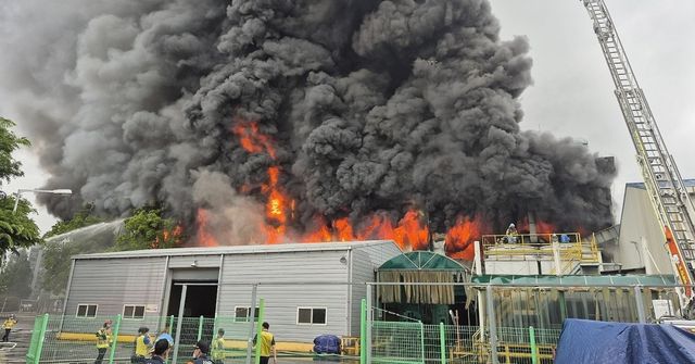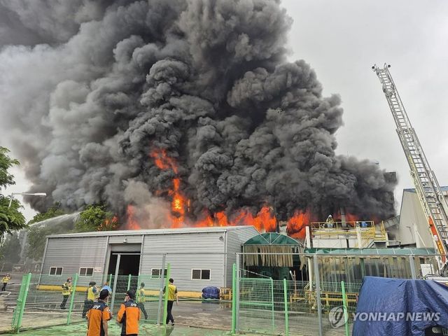 17일 오전 광주 광산구 소촌동 금호타이어 공장에서 불이 나 소방당국이 진화하고 있다. / 독자 제공=연합뉴스