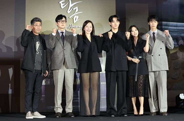 김홍선 감독(왼쪽부터)과 배우 박병은, 엄지원, 정가람, 조보아, 이재욱이 지난 13일 서울 구로구 라마다서울 신도림 호텔에서 열린 넷플릭스 시리즈 '탄금' (극본 김진아) 제작발표회에 참석해 포즈를 취하고 있다. '탄금'은 실종되었던 조선 최대 상단의 아들 홍랑(이재욱 분)이 기억을 잃은 채 12년 만에 돌아오고, 이복누이 재이(조보아 분)만이 그의 실체를 의심하는 가운데 둘 사이 싹트는 알 수 없는 감정을 그린 미스터리 멜로 사극이다 / 뉴스1