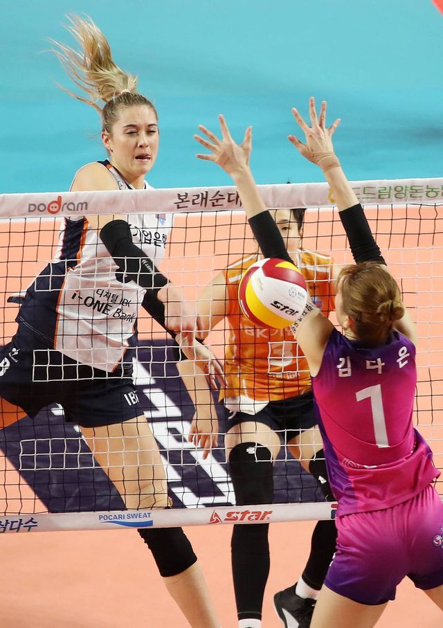 2021년 경기도 수원시 장안구 수원실내체육관에서 열린 프로배구 '2021-22시즌 도드람 V리그' 여자부 현대건설과 기업은행의 경기에서 기업은행 라셈이 공격을 하고 있다 / 뉴스1