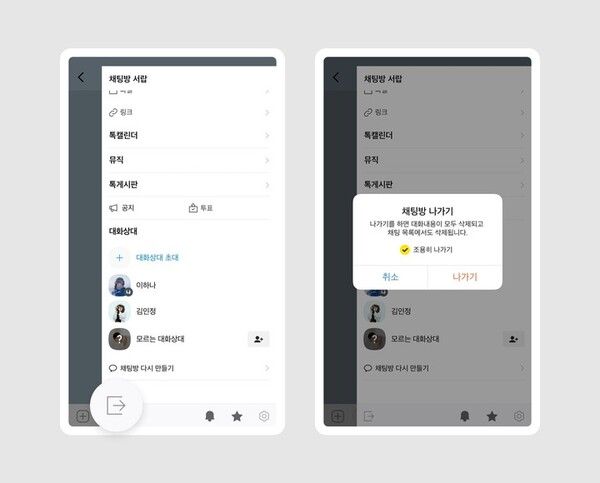 특히 '조용히 나가기'는 카카오톡 역대급 업데이트라는 평가를 받았습니다. 단톡방을 나가고 싶어도 '○○○님이 나갔습니다' 문구 때문에 눈치 보여 선뜻 나가지 못했던 이용자들이 많았기 때문입니다. 이용자들의 요구가 빗발쳐서 국회에서 '조용히 나가기' 기능을 보장하도록 하는 법안까지 발의될 정도였죠.