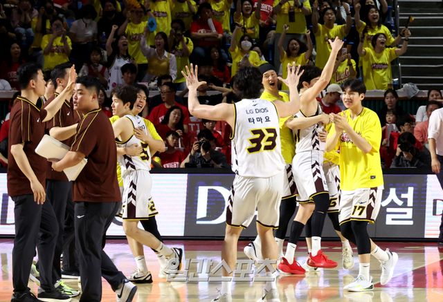 기세를 쥔 LG는 양준석과 타마요가 연이어 3점을 터뜨리며 승세를 가져갔다. 5분 36초를 남기고 허일영의 외곽포까지 터지면서 격차가 10점으로 벌어졌다. 허일영의 득점 후 작전타임이 선언되자, LG 선수단은 코트로 나와 환호했다. 팬들 역시 박수와 환호로 우승을 예감했다.
