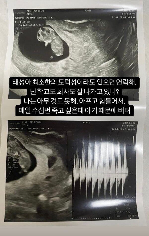 "매일 수십번 죽고 싶은데 아기 때문에 버텨"라고 덧붙이며, 태아 초음파 사진을 올렸다.