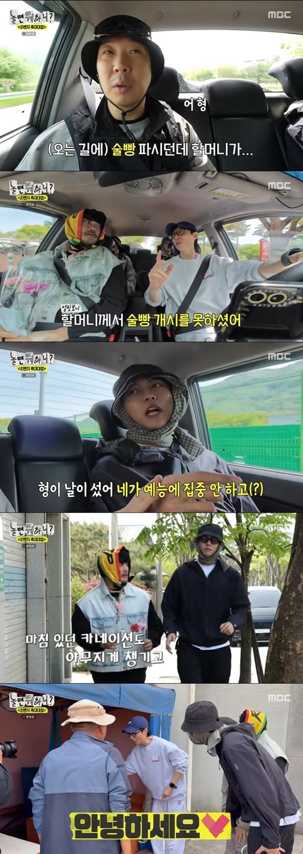 이날 운전을 하던 유재석은 "이제 지나와서 하는 얘긴데 저기 할머니가 술빵 파신다"라고 말하자, 하하는 곧바로 "U턴하시죠"라고 말했다.