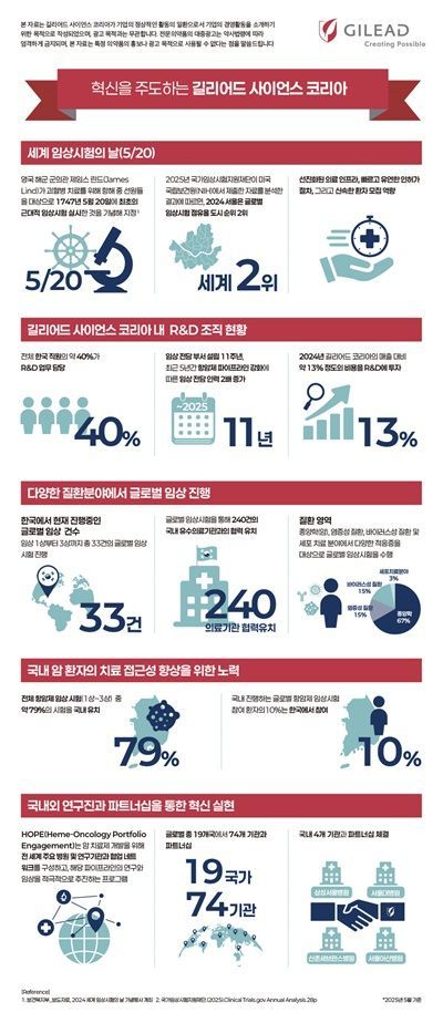뉴시스 보도에 따르면, 18일 길리어드 사이언스 코리아에 따르면 이 회사는 세계 임상시험의 날(5월 20일)을 맞아, 국내외 연구개발(R&D) 활동 성과를 조명하는 인포그래픽을 공개했다.