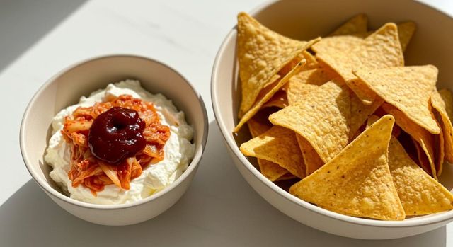 기사 내용을 토대로 AI 생성 프로그램을 활용해 만든 이미지, 김치와 고추장, 크림치즈로 만든 디핑 소스와 나쵸칩