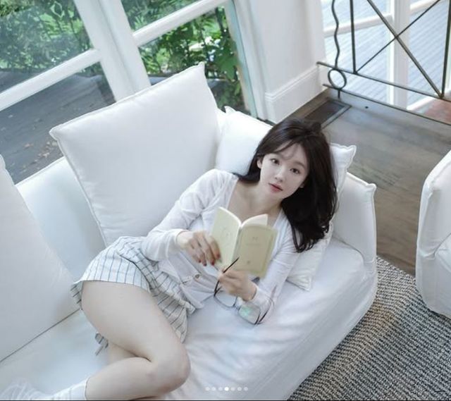 화이트 가디건에 줄무늬 쇼츠를 입고 소파에 누운 강민경은 한 손엔 책을 들고, 한쪽 다리를 자연스럽게 꼰 채 카메라를 바라봅니다.