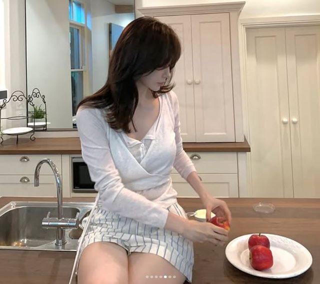 강민경이 들고 있는 건 사과지만, 시선은 전부 강민경에게 쏠릴 수밖에 없습니다.