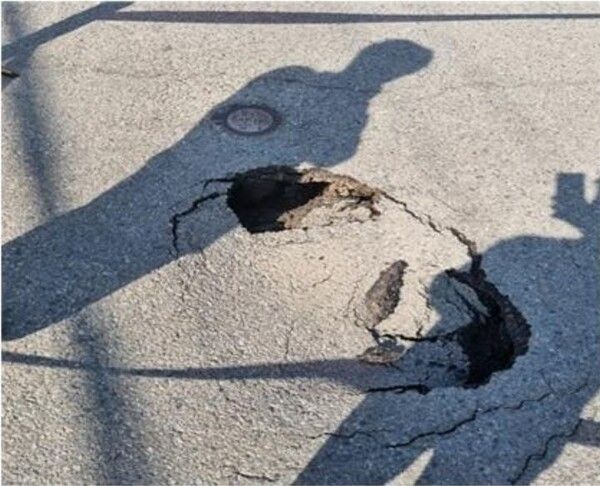 곧바로 현장에 출동한 시 및 소방당국은 지름과 깊이 약 50㎝의 싱크홀을 확인하고 라바 콘 등으로 임시 조치했다.