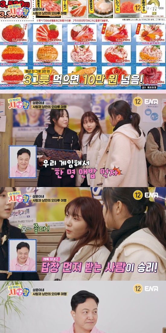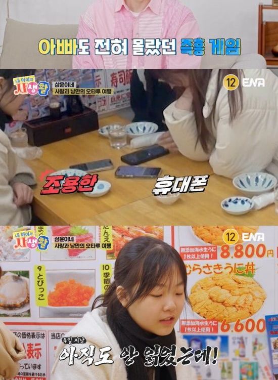 세 자매는 해산물 덮밥 카이센동을 먹으러 향했는데, 한 그릇 당 3만원이 넘는 식사 가격에 놀라움을 감추지 못했다. 결국 세윤 양은 "우리 게임해서 한 명 맨밥 먹자"고 제안했고, 두 동생도 모두 내기에 응했다.
