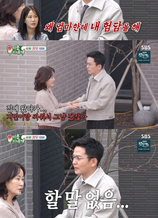 이어 김지민 어머니가 "작년인가 재작년에 집에 왔다가 지민이랑 싸워서 그냥 갔지 않냐. 내가 집안에 어른인데 얘기도 없이"라고 하자 김준호는 "다시 왔다"고 답했고, 김지민 어머니는 "나가긴 왜 나갔냐 다시 올 건데. 그때 그냥 보내려다가 전화해서 다시 돌아왔다. 섭섭했는데 처음 말한다"고 털어놨다.