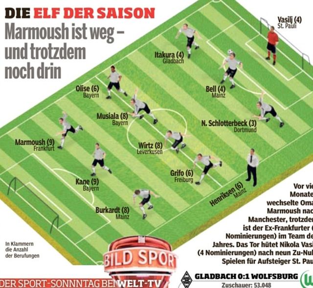 독일 유력지 '빌트'는 18일(한국시간) 2024-25시즌 분데스리가 베스트 11을 발표했다.