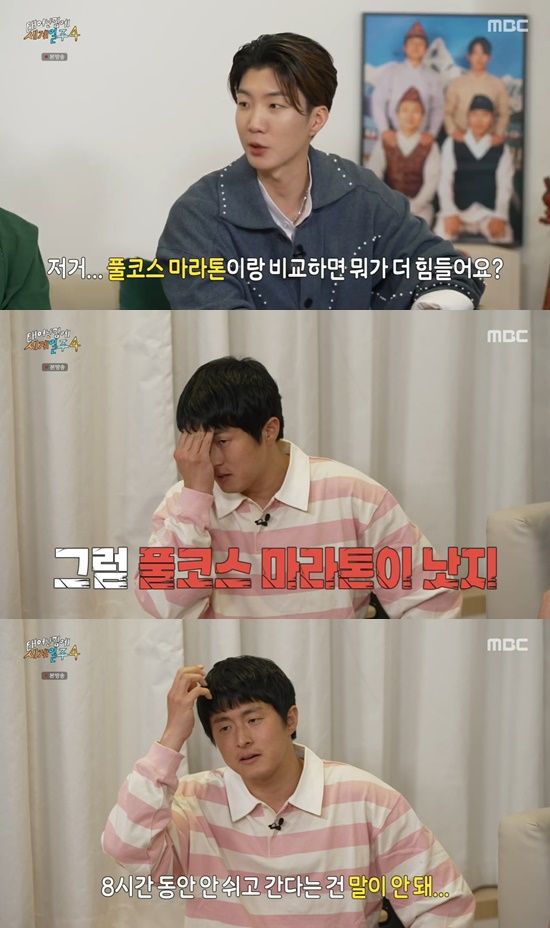 이를 본 이승훈은 "풀코스 마라톤이랑 비교하면 뭐가 더 힘드냐"고 물었고, 기안84는 잠시 고민하더니 "만약에 로테이션(짐 나눠 들기) 없으면 풀코스 마라톤이 낫다. 8시간 동안 안 쉬고 간다는 건 말이 안 된다"고 털어놨다.