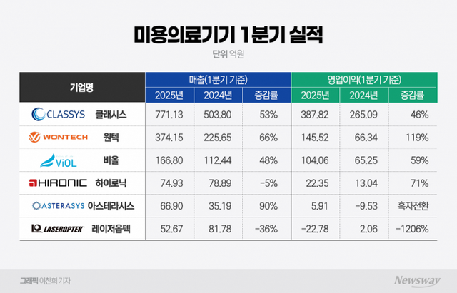 19일 업계에 따르면 주요 상장사 미용의료기기 기업 6곳(클래시스, 원텍, 비올, 하이로닉, 아스테라시스, 레이저옵텍) 중 4곳이 전년 대비 매출이 늘었다.