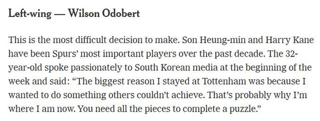 매체는 "이번 유로파리그 결승에서 가장 고민이 많은 포지션 선택이 바로 왼쪽 공격수였다"고 전제한 뒤, "손흥민은 토트넘에서 지난 10년간 해리 케인과 함께 가장 중요한 선수 중 하나였지만, 큰 경기에서 감정에 휘둘려서는 안 된다"고 지적했다.