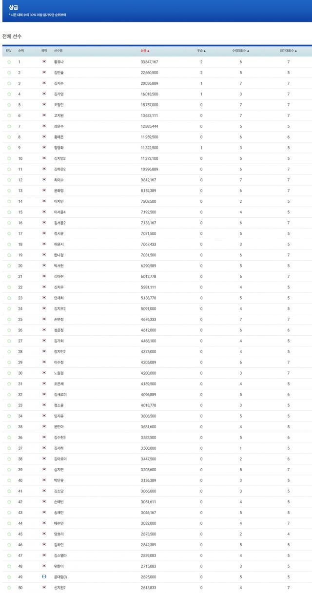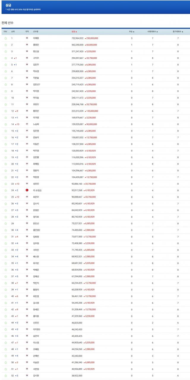 ■상금순위(제17회 두산 매치플레이 종료 기준)