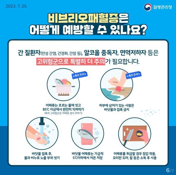 비브리오패혈증을 예방하기 위해서는 ▲어패류의 경우 85℃ 이상에서 충분히 익혀 섭취하기 ▲피부에 상처가 있는 경우 바닷물 접촉 자제하기 ▲어패류 손질 후에는 깨끗이 손씻기 ▲기저질환자 어패류 생식 피하기 ▲냉장·냉동 어패류의 위생적 보관 등의 수칙을 준수해야 한다.