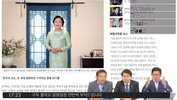이 영상에는 김 후보를 비롯해 차명진 전 의원, 이동욱 경기도의사회장이 함께 출연했다. 세 사람은 김 여사가 2020년 10월 '간디 탄생 150주년 웹 세미나'에 보낸 영상 축사의 한 장면을 띄워놓고 대화를 나눴다.