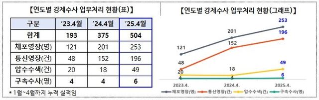 [와이뉴스] 고용노동부에 따르면 ’25년 4월 기준으로 구속수사, 체포영장 집행 등 강제수사 실적이 504건으로 지난해 같은 시기에 비해 크게 증가(34.4%)한 것으로 확인됐다. 이는 ’23년 4월(193건)과 비교하면 무려 2.6배나 증가한 수치이다.