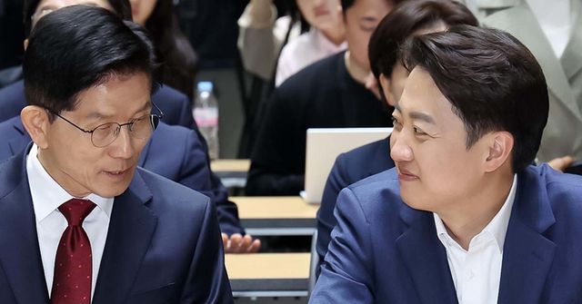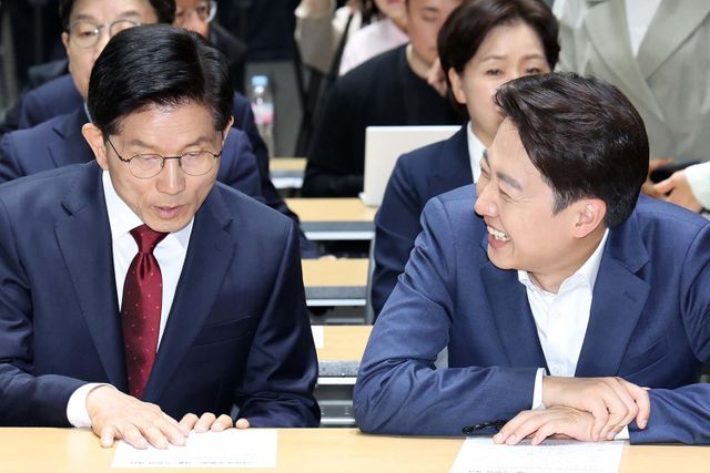 김문수 국민의힘 대선 후보와 이준석 개혁신당 대선 후보가 서로를 칭찬하며 덕담을 주고받았다. 이번 대통령 선거의 최대 변수인 ‘후보 단일화’와 맞물려 관심을 끈다.