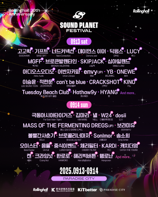 또한 한로로, 튜스데이 비치 클럽, 고고학, 극동아시아타이거즈, 스킵잭 등 독창적인 색깔로 떠오르고 있는 신예 뮤지션들에 더해 루시, 켄, 키노, 더블유24, 원위, 캐치더영 등 세련된 사운드와 감각적인 무대로 사랑받는 아티스트들까지 더해져 장르와 세대를 아우르는 다채로운 라인업이 완성되었다.