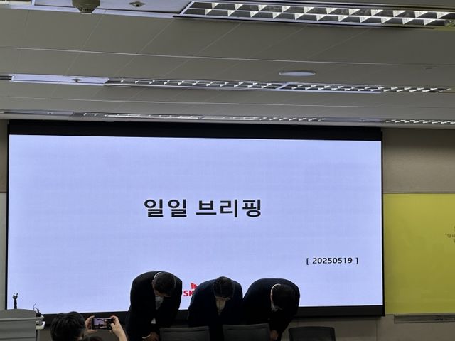 SKT 임원들이 이날 진행한 일일 브리핑에서 최근 발생한 해킹 사태에 대해 사과의 말을 전했다. 사진=강준혁.
