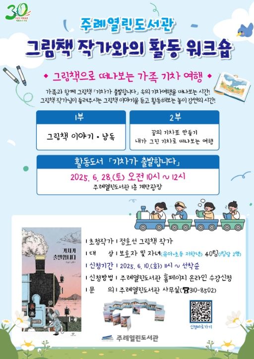 워크숍은 그림책 제작 과정 이야기 및 낭독을 듣는 1부와 기차와 기차표를 아이들이 직접 그리고 기차여행을 떠나보는 2부로 구성되며 참가 신청은 6월 10일 오전 11시부터 주례열린도서관 홈페이지 온라인 수강신청을 통해 진행된다.