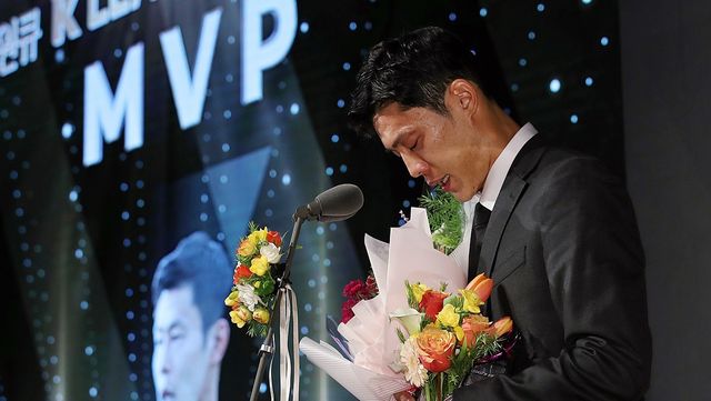 '하나원큐 K리그2 2021 대상' 시상식에서 MVP로 뽑힌 뒤 눈물을 보인 안병준 / 뉴스1