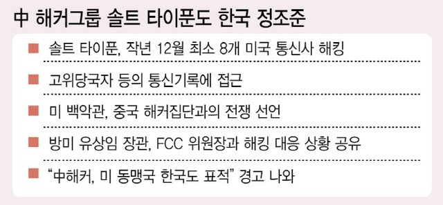 미·중 간 사이버 주도권 경쟁이 본격화되는 가운데, 중국 해커 조직이 미국의 동맹국인 한국을 겨냥하고 있다는 분석도 나온다. 대만 사이버보안 기업 팀T5는 최근 보고서에서 중국 해커 그룹 ‘솔트 타이푼(Salt Typhoon)’이 한국을 지속적으로 표적삼고 있다고 지적했다. 앞서 미국 백악관은 지난해 12월 솔트 타이푼이 미국 내 최소 8개 통신사를 해킹해 고위 당국자들의 통신기록에 접근한 사실을 공개하며, 중국 해커 집단과의 사이버 전쟁을 공식화한 바 있다.