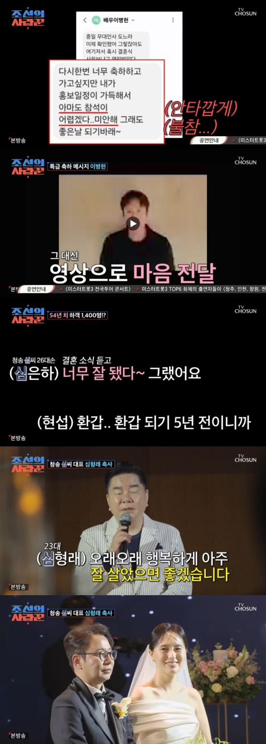 이병헌은 영상 편지를 통해 "신랑 심현섭 군과 신부 정영림 양의 결혼을 진심으로 축하드린다. 부족한 저의 후배지만 잘 좀 부탁드리겠다. 두 분이 건강하고 행복한 결혼 생활을 이어 나가시길 바란다. 다시 한번 축하드린다"라며 축하했다.