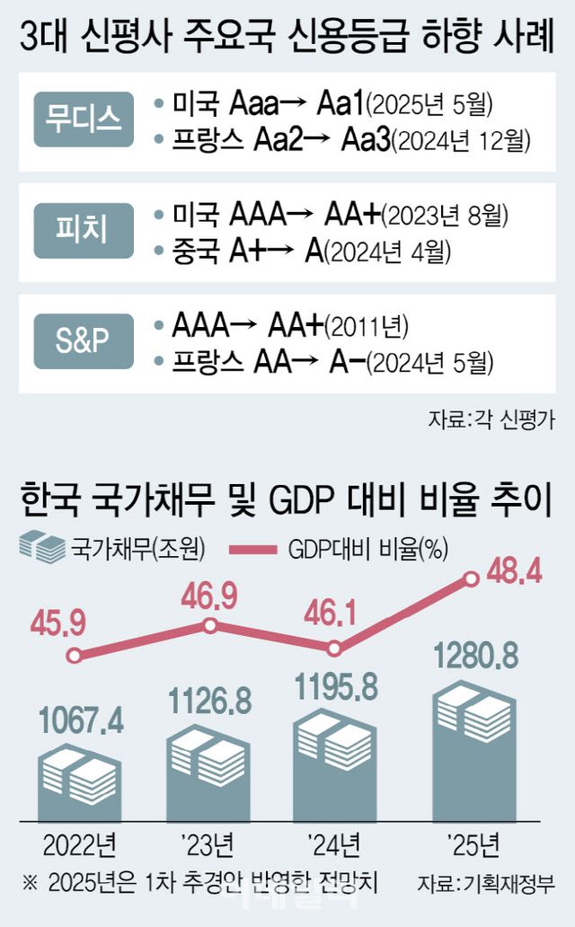 미국의 국가부채는 36조 2200억 달러(약 5경 744조 원)로, GDP 대비 부채 비율도 지난해 기준 123%에 이른다. 3대 글로벌 신평사(무디스·S&P·피치) 중 S&P가 지난 2011년 미국 신용등급을 AAA에서 AA+로, 피치가 2023년 8월에 AAA에서 AA+로 각각 내린 바 있다.