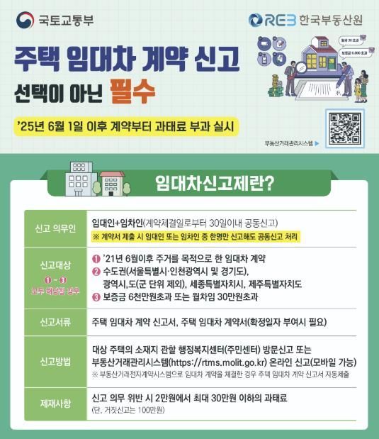 신고 대상은 보증금 6000만 원 초과 또는 월세 30만 원 초과 주택 임대차 계약이며 주택 소재지 관할 주민센터를 방문하거나 부동산거래관리시스템에 접속해 PC·모바일 신고도 가능하다.
