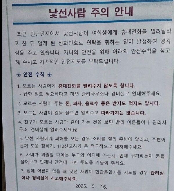 안내문은 모르는 사람에게 휴대전화를 빌려주지 말고, 낯선 사람이 건넨 음식도 받지 말라고 했다. 또 낯선 사람이 현관문을 열려고 시도하거나, 친구가 모르는 사람과 함께 이동하는 모습을 보면 어른이나 관리사무소, 경비실에 도움을 요청하라고 당부하는 내용도 적혀있다.