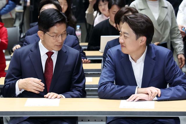 김문수 국민의힘 대통령 후보(왼쪽)와 이준석 개혁신당 대통령 후보가 19일 오전 서울 중구 서울시청에서 열린 '약자와 동행하는 서울 토론회'에 참석해 나란히 앉아 있다. / 뉴스1
