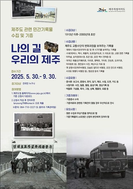 이번 수집·기증은 제주 근현대사 속 소중한 문화·역사를 보존하기 위한 것이다. '나의 길, 우리의 제주'를 주제로 1910년대부터 2000년대 초반까지 생산된 문서류, 시청각류, 박물류 등 모든 형태의 기록물을 기증받는다.