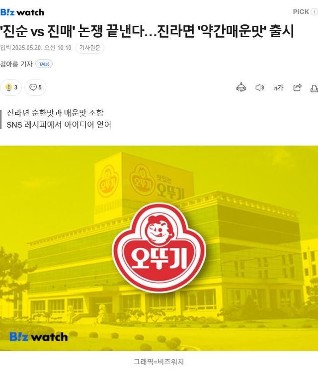 오뚜기 관계자는 "최근 SNS를 중심으로 진라면 순한맛과 매운맛을 조합한 레시피가 화제를 모으면서 이를 반영한 신제품 출시 요청이 꾸준히 이어졌다"며 "진라면 약간매운맛을 통해 진라면을 더욱 다양하게 즐기고 새로운 맛의 재미를 경험하길 바란다"고 말했다.