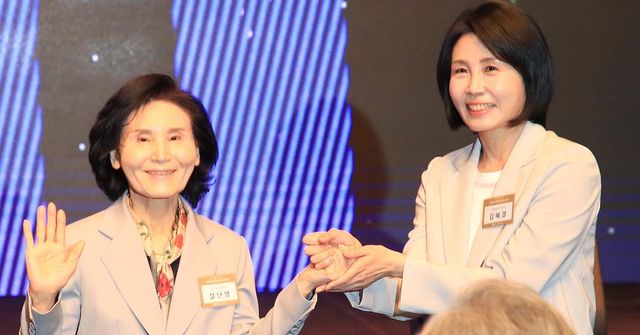 이재명 더불어민주당 대통령 후보의 부인 김혜경(오른쪽) 여사와 김문수 국민의힘 대통령 후보의 부인 설난영 여사가 지난 12일 서울 중구 신라호텔에서 열린 중앙신도회 창립 70주년 기념식에 참석해 손을 잡고 있다. / 조계종 제공