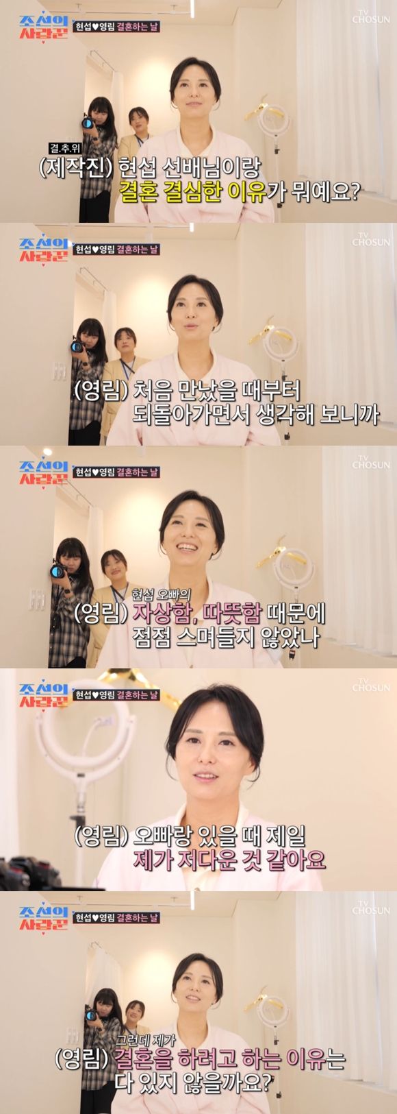 이에 정영림은 "되게 자연스럽게 결심하게 됐다. 처음 만났을 때부터 되돌아보면서 '내가 왜 이 사람이랑 결혼하려고 생각했지?' 하면, 오빠의 자상함, 따뜻함 때문에 점점 스며들지 않았나. 오빠는 항상 저를 웃게 해줘요. 오빠랑 있을 때 제일 저다운 것 같아요"라며 심현섭에 대한 진심을 드러냈다.