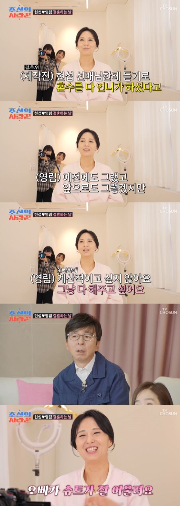 정영림은 이에 동의하며 "예전에도 그렇고 앞으로도 그렇겠지만 다른 사람들은 어떻게 하는지 모르겠다. 하지만 저는 오빠한테 계산적이고 싶지 않아요. 그냥 다 해주고 싶어요"라며 신현섭에 대한 애정을 드러냈다.
