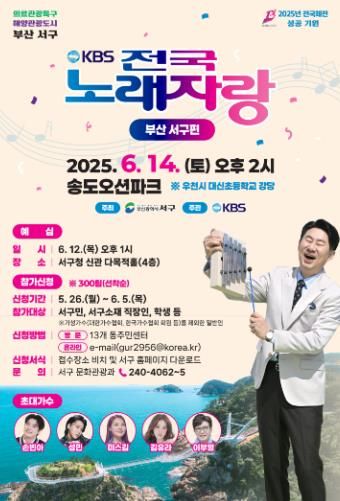 [파이낸셜경제=김영란 기자] 대한민국 대표 장수 프로그램 KBS 전국노래자랑의 '부산 서구편'이 오는 6월 14일 오후 2시 송도오션파크에서 열린다.