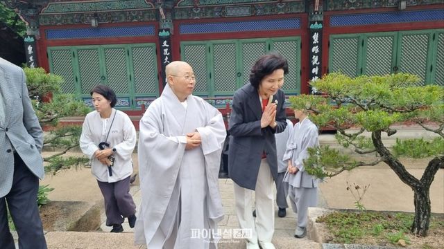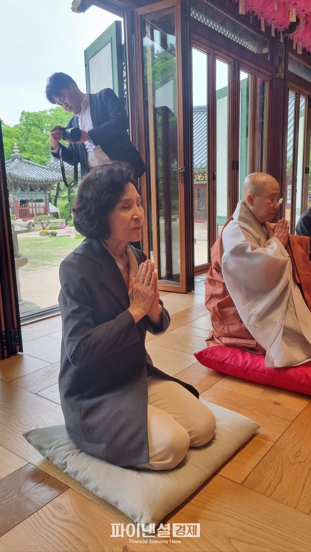 | ▲ 국민의힘 김문수 대선후보의 부인 설난영 여사가 20일 오전 북한산국립공원 자락의 은평구 관내 진관사를 방문, 대웅전에서 기도를 하고 있다./사진=대선 특별취재팀 |