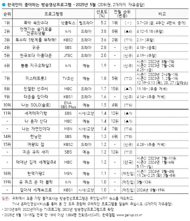 '한국인이 좋아하는 방송영상프로그램' 2025년 5월 조사 결과. / 한국갤럽 제공