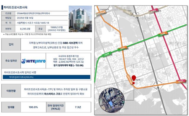 하이트진로 서초사옥은 서울 서초구 서초동 1445-14번지 일원에 있으며 지하 3층~지상 18층, 연면적 3만7076.46㎡(1만1215.63평) 규모다. NH올원리츠가 이 건물을 매입한 시점에서 계산한 캡레이트인 ‘이니셜 캡레이트’는 5.45%다.