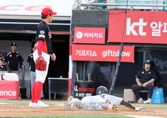 윤영철은 1회 크게 흔들렸다. 1회 1사 후 김민혁에게 볼넷을 내준 뒤 안현민에게 2루타를 맞은 윤영철은 폭투로 선취점을 내줬다. 이후 장성우를 삼진 처리했으나 멜 로하스 주니어에게 볼넷을 내준 뒤 강백호에게 적시타를 맞으며 추가 실점했다.