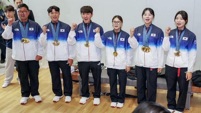 2024 파리올림픽 양궁 5개 전종목을 석권한 대한민국 양궁 국가대표팀 선수들이 인천국제공항을 통해 귀국해 파이팅을 외치고 있다. / 뉴스1