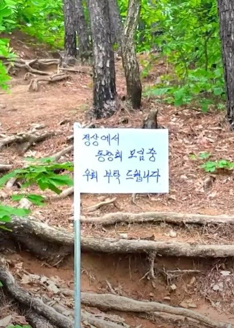 팻말에는 '정상에서 동창회 모임 중. 우회 부탁드린다'고 적혀 있었다.