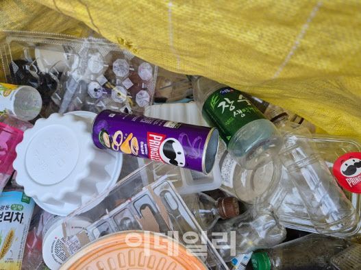 이데일리가 지난 8일 오후 찾은 서울 강남구 압구정동의 200세대 이상 아파트 단지 분리수거장. ‘비닐류’라고 적힌 봉투 안에는 플라스틱의 일종인 EPE(발포 폴리에틸렌) 재질의 과일 그물망이 버려져 있었다. 환경부 가이드라인에 따르면 과일망은 일반쓰레기로 버려야 한다. 바로 옆에 있는 ‘플라스틱류’ 봉투에는 유선 청소기 본체와 전선이 함께 담겨 있었다. 언뜻 보기에는 플라스틱 통만 버려진 듯한 이 봉투 안에는 자세히 살펴보니 고무와 철제 스프링, 플라스틱 등 여러 소재가 섞인 화장품 용기와 과자 통도 눈에 띄었다.