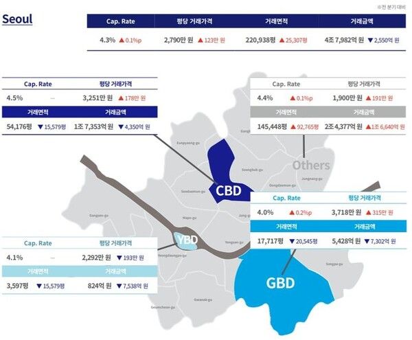CBD 임대료는 전 분기 대비 3.0% 올랐고, GBD는 4.3%, YBD는 2.9% 상승했다. 기타권역에서도 2.9% 올랐다.